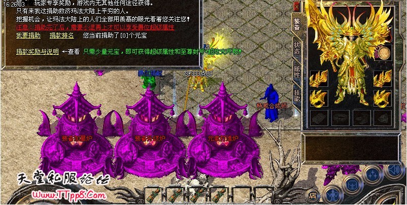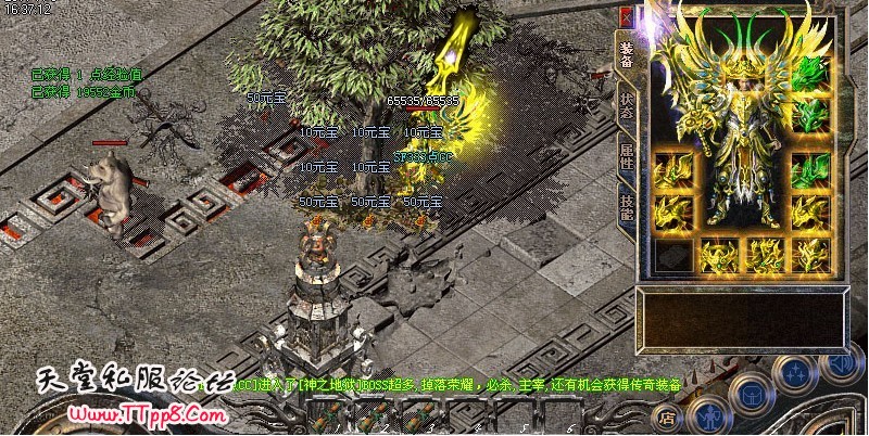 【特色活动】:二小时特戒神殿刷特戒使者几乎有机会爆特戒、60分钟土药刷新一棵摇钱树,每次暴2000以上元宝,20分钟土药刷新两大怪物,带有丰富宝藏!