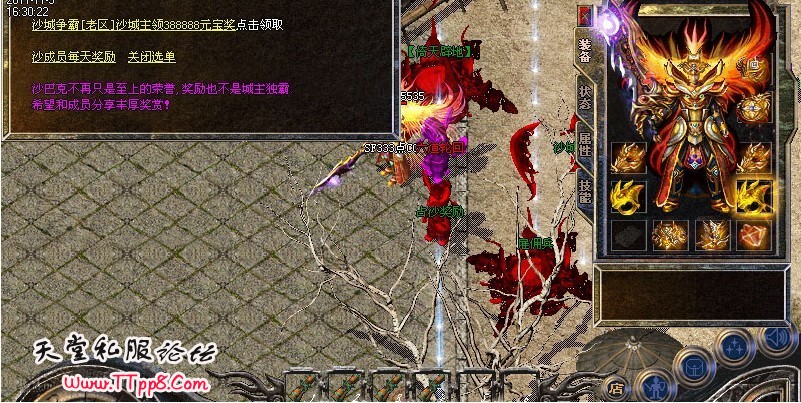 【特殊刷新】:以下地方均30分钟刷新指定BOOS、封魔殿-日本天皇 牛魔7层-火龙神 沙城藏宝阁-魔龙教主 祖玛教主之家-暗之祖玛教主 骨魔5层-法玛教皇