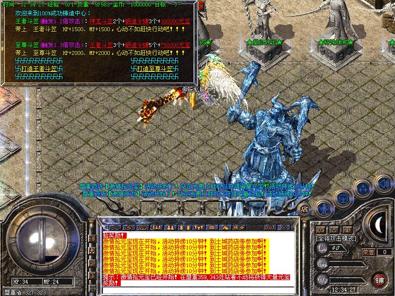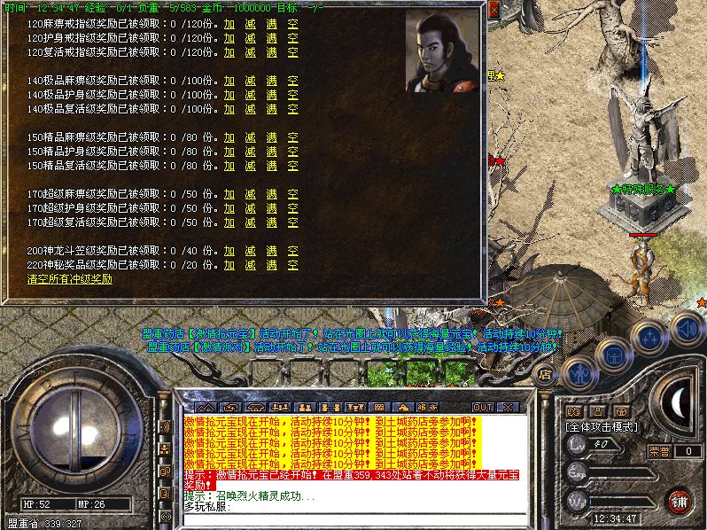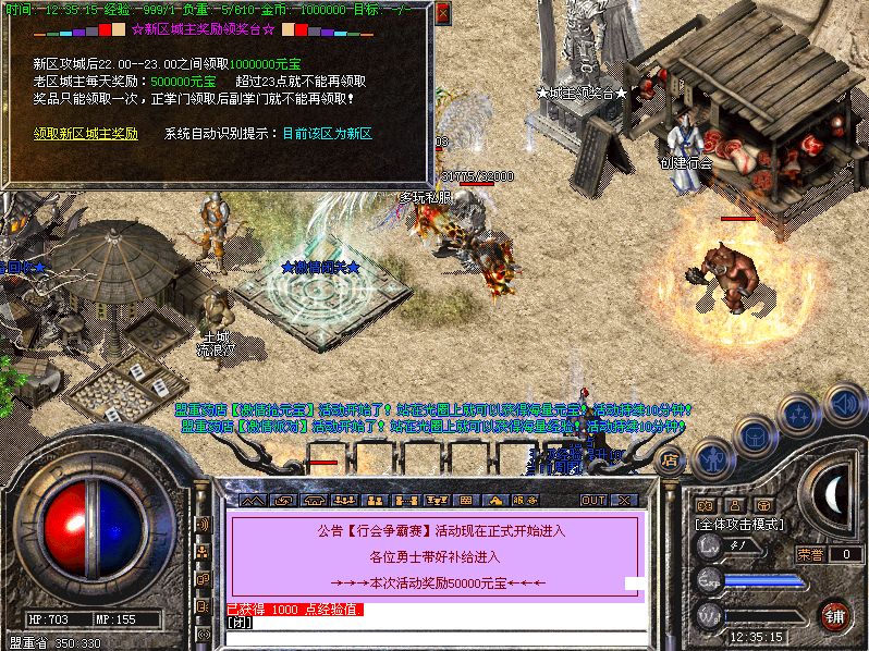 关于攻沙奖励的公告:新区第一任沙巴克城主奖励:150万元宝;老区(合区后)攻沙的奖励为:50万元宝;