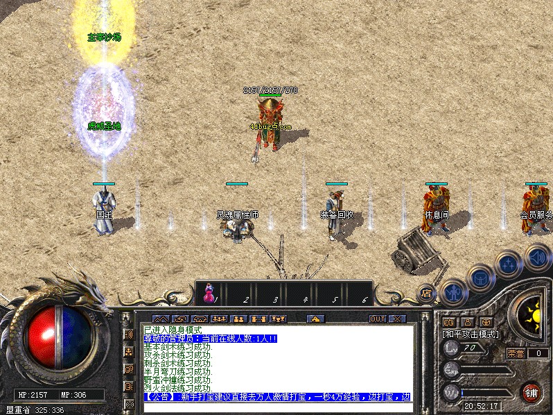 特色:行会战系统。 系统每两小时进行一次行会战争,战争地图30秒加300万经验和杀死每只怪+500点荣誉值,刷出的怪能爆顶级,激情无限,请大家踊跃参加。