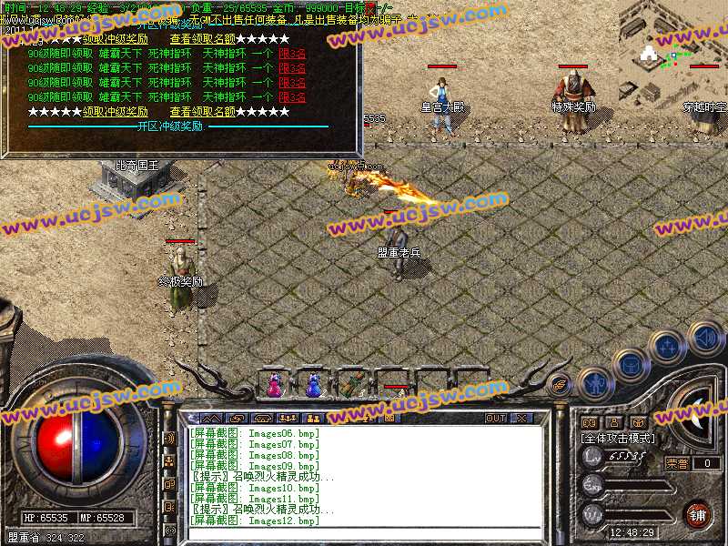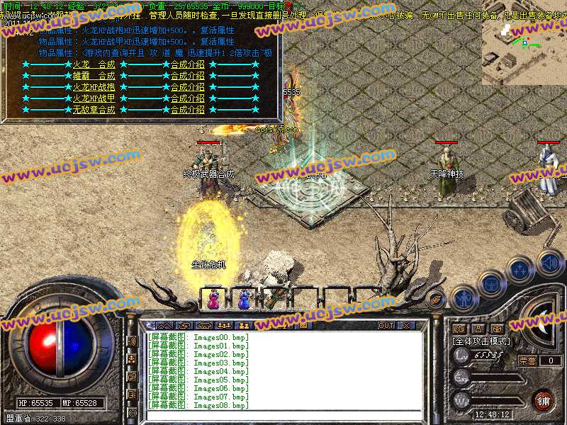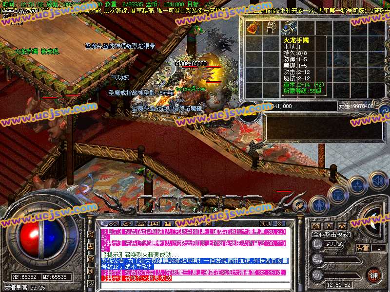 【特色⒉】:狂暴之泉,皇宫大殿,层次越深,暴率越高.唯一可暴出新装备→究级套装的地图!四级技能2小时开放一次,天下第一称号可获1.2倍攻击,天神戒,死神戒均为1.2倍攻击属性!!