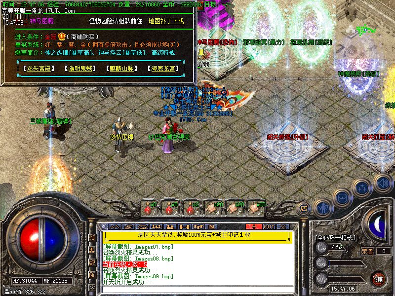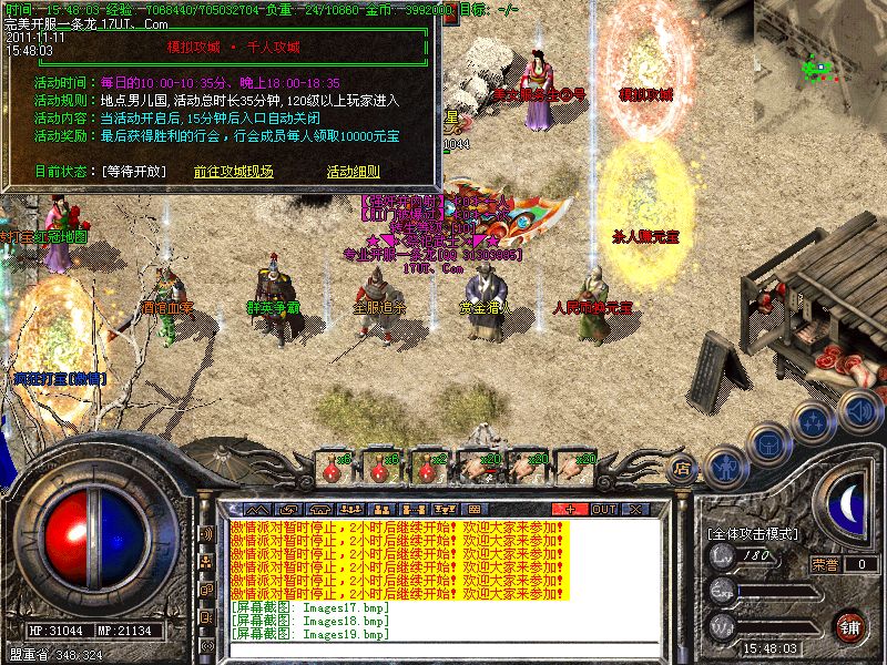【模拟攻城】全服100以上玩家才可以进入,下午15,晚上19点各一场,再现千人攻城场面,杀死守卫及城主,获得不同数量元宝,即杀即得