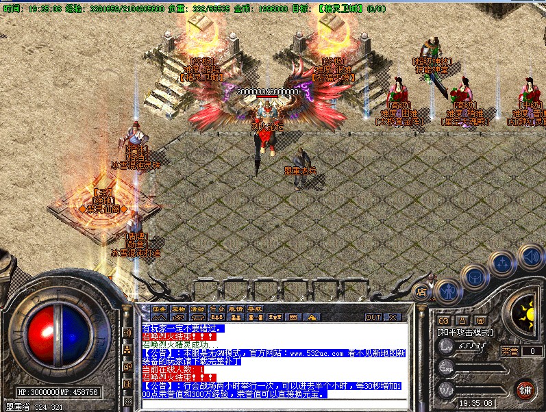 【公告】:行会战场两小时举行一次,可以进去半个小时,每30秒增加100点荣誉值和300万经验,荣誉值可以直接换元宝。