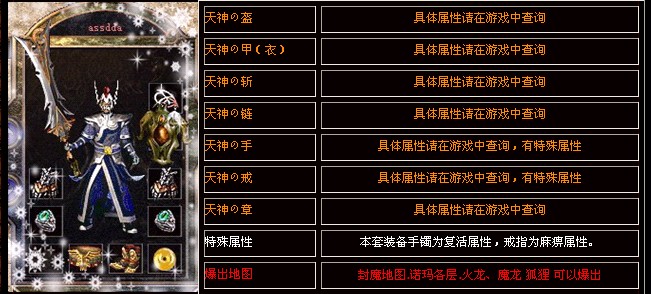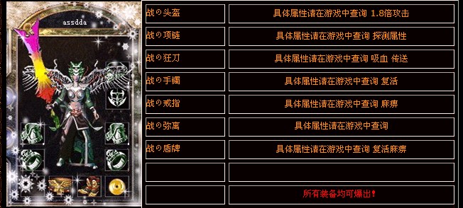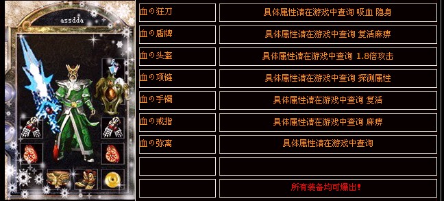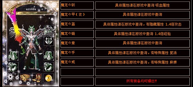 本游戏所有装备全部爆出,只要你付出努力,不论你是花钱与非花钱,都会得到对等的回报,装备是靠您辛勤去打出来的,而不是站在安全区冲点元宝就可以得到的!