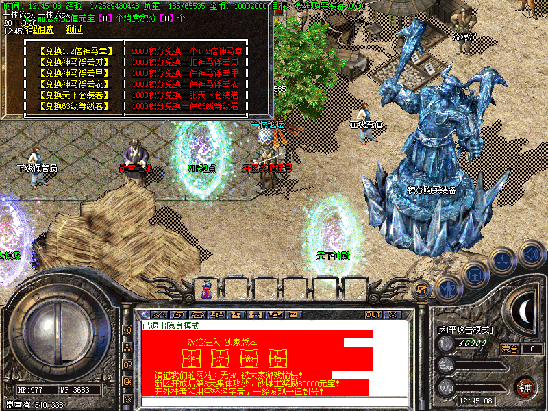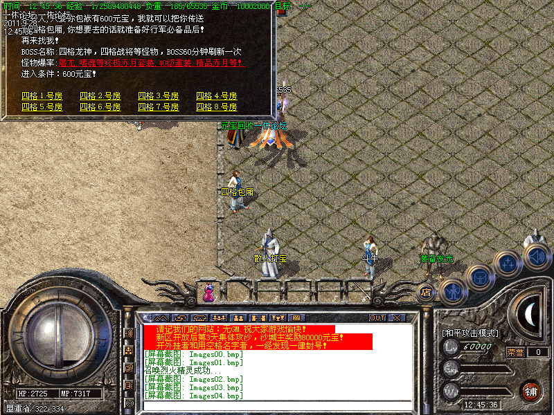 提示:本服务器高级怪物30分钟刷新,沙宝阁怪物60分钟刷新,新衣服暴率为1/50。赤月首饰暴率为1/20,赤月武器1/50。武器最高可升级7点,1分钟可取。祖玛教主,烟花恶魔,赤月恶魔出屠龙嗜魂,地藏王出霸者之刃!