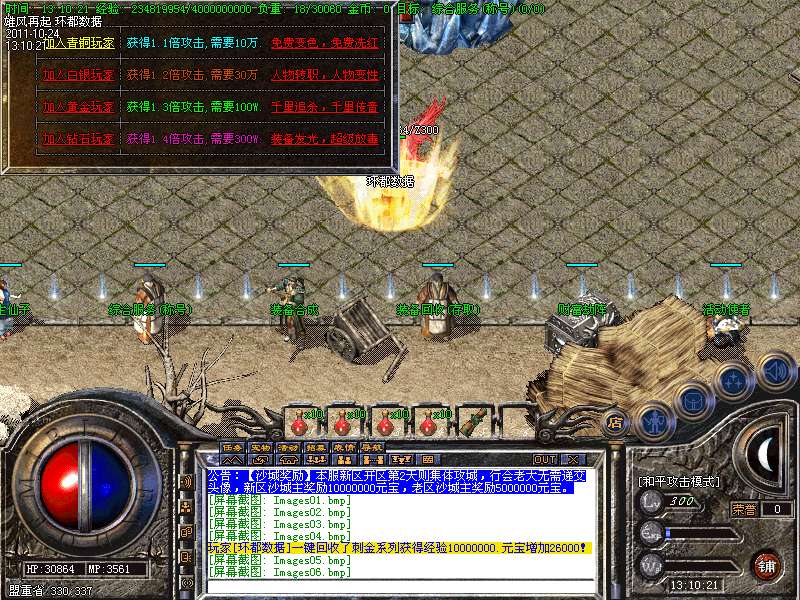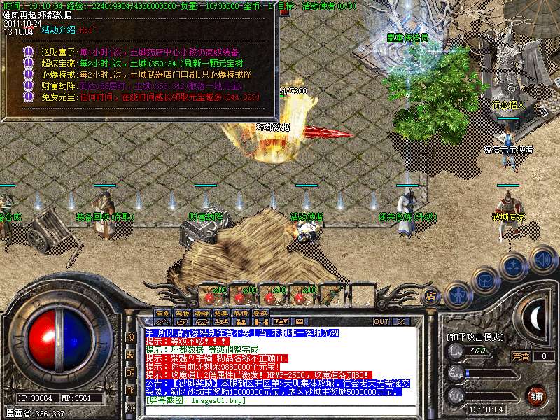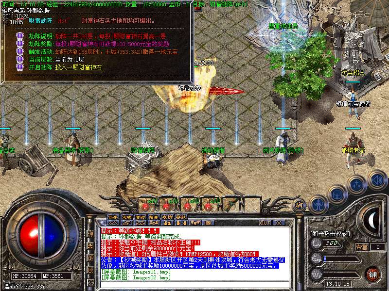 【更新】财富劫阵,BOSS爆出财富神石可以启动财富阵,启动的同时可以随机获得元宝!!满188层土药将会出现大量的元宝!!具体请查看土城财富劫阵NPC!!