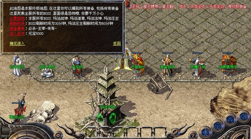 魔龙,盘古之地,等地图狂爆赤月,魔龙装备. 32000的终极BOSS均可爆出战神装备 雷霆战甲,凤天,星王冠,星王腰带,星王靴, 开天,天龙圣衣,天龙圣剑,等终极装备