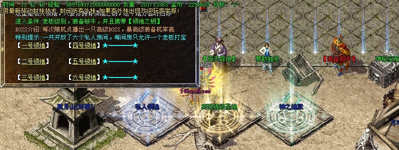 23.私人领地,本服一大特色,刷新本服所有超级BOSS,想独自享受打怪乐趣的玩家有福气了,进入需要一把--领地之钥,可以打怪爆出,也可以商铺直接购买!【注:本服商铺重要物品价格已经低至极限】