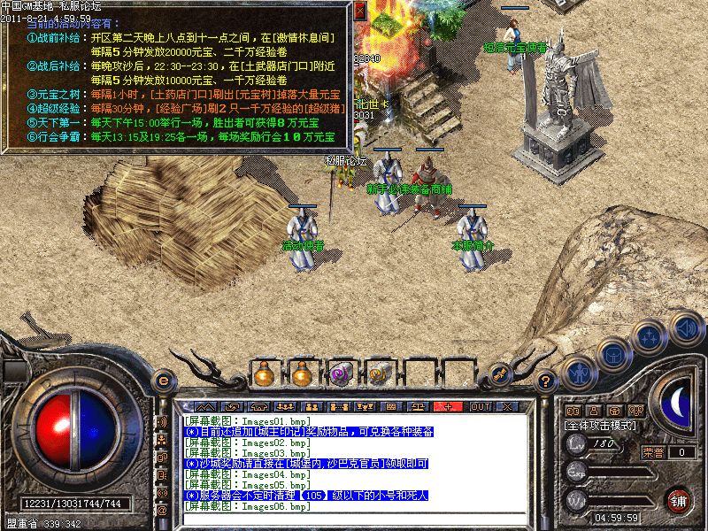 (*)每晚攻沙后,22:30--23:30,在[土武器店门口]附近每隔5分钟发放10000元宝、一千万经验卷
