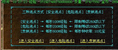[250]特色一:快速的升级模式,免费泡点,每秒100W经验。[激情殿堂]只有一人在地图内的时候每秒获得经验500W.从传送员进入[贵族泡点]每秒享受1亿经验
