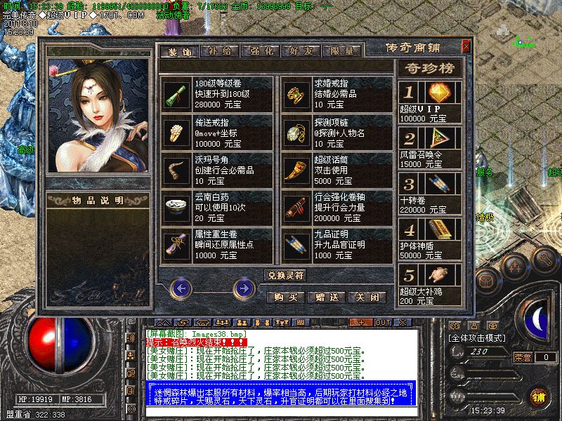 完美网络2011巨献—1.89江山中变靓装元素版,版本采用传奇版本中HERO游戏引擎,打破传统死板玩法,升级快,爆率高,全新游戏模式独特的游戏方式,独创不可多的1.89的特色游戏功能,增强了版本的可玩性,调整了怪物爆率,加强了物品极品爆率,让玩家无论是在打怪练级,PK寻宝都能得到一个全新的体验,加入了爵位捐献转生加官进爵等,另外还加入了装备加星元素系统,让玩家乐此不彼,极品的爆率更是让你目不暇接,并且加入全新的游戏功能,让玩家乐不思蜀,是您长期开区的不二选择。开区一条龙联系QQ:31303995