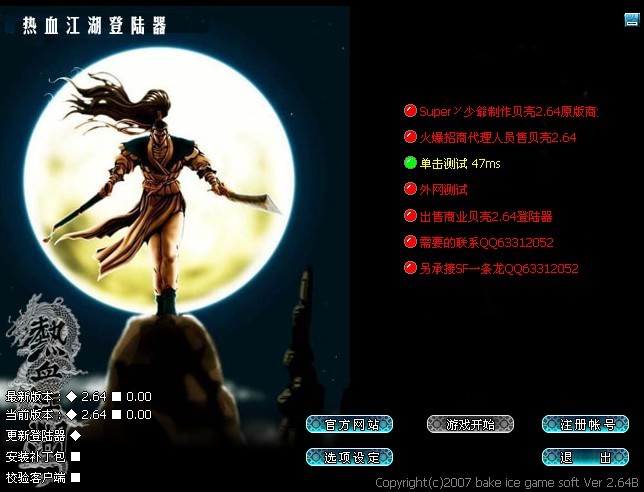 下面打个广告,热血江湖原版贝壳2.64登陆器,购买请联系QQ63312052!另诚招代理贝壳2.64登陆器销售人员有意合作的,联系我QQ63312052!绝对让你赚,另免费给GM朋友们制作贝壳2.61原版商业登陆器,没开服的就不要来了,登陆器日期直接是2011年1月1日过期省得麻烦,凡是在我这买登陆器的我们可以免费送你们5个登陆器不一样外观模板