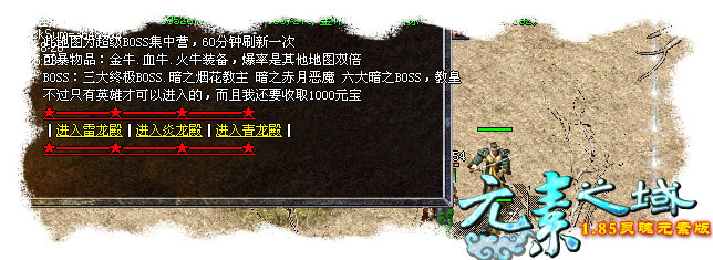 e.魔龙血域:60分钟刷新两只魔龙教主,一只暗之魔龙教主,一只教皇,暴战神.金牛.火牛.血牛.