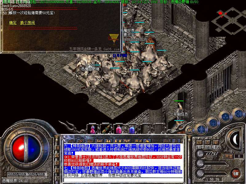 16.【特别地图】恶魔世界此地图大小BOSS刷新均比较快,适当结伴边抽烟边打宝,狂暴野猪此类小猪也能暴出赤月装备。烟花教主每60分钟刷新