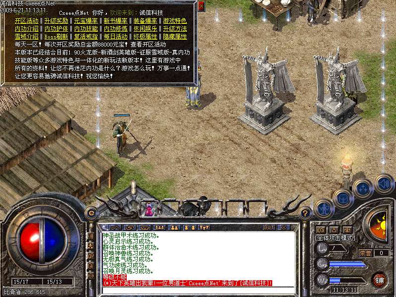 ⒊欢迎进入<$SERVERNAME>服务器!因本版本是唯一四大版本修改综合版!请所有玩家务必看下土城NPC(内功游戏攻略)!看完之后您才会了解本版本的独特性和新玩法新功能!谢谢您的支持!兑换荣誉查询火龙将军!六大功勋及热血之刃查询天外来客!兑换王者装备查询王者特使!