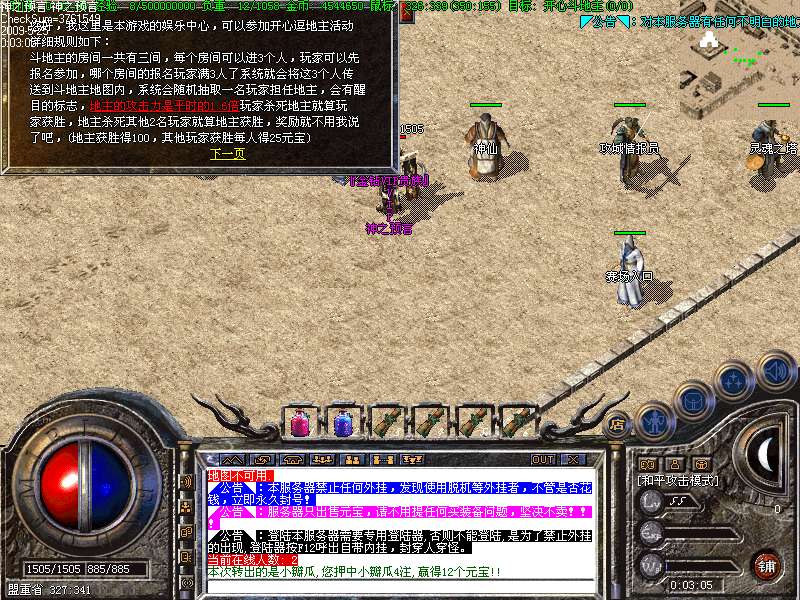 2: 增加了开心斗地主系统,玩家可以通过开心斗地主赌博的方式进行PK,地图内每次进入3个人然后会随机选取一位当地主,地主的攻击力是平时的1.6倍,其他2位玩家正常,比赛的方式就是2v1哪方胜利哪方便可以得到对方的元宝,等级限制是5级以内