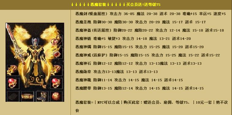 二:去掉赤月套装等以下的垃圾爆出(保留个别地图爆为了给大家打了换声望) 三:当你累计了一定数量的装备后可合成更高一级的装备,比如3只(雷霆战戒)可以合成(雷霆战戒①),合到第九次为(<终极>),这种玩法可以让你玩上一两年也不会烦腻。赤月套装、怒斩、龙牙、逍遥扇、麻痹、护身、复活都可以合成。