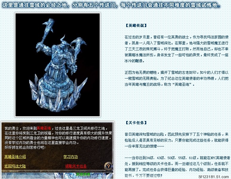 在过去的岁月里,曾经有一位英勇的战士,作为寻找玛法家园的使者,孤身一人闯入了雪域深处。在那里,他与强大的雪域魔王进行了三天三夜的殊死搏斗,终于把魔王打败,然而他自己,却也不幸被黑暗冰魔法所伤,身体发生了一些可怕的异变,最终变成了一座冰冷的雕像。