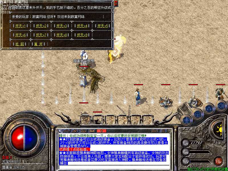 ★★打到的装备可以合成高级装备,比如2个普通开天就可以合成+1的,2个+1的开天又可以合成+2的开天。所有装备相关的具体操作可以查看土城装备管理员NPC。