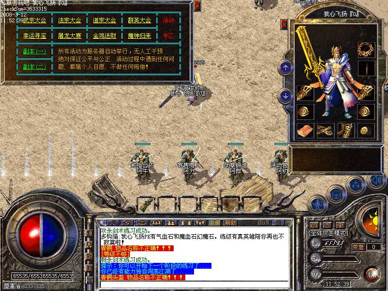 ★精彩活动 武宗大会,法宗大会,道宗大会,群英大会,幸运寻宝,金鸡送财,屠龙大赛,魔神归来 等等多个活动。具体内容请到游戏中查询.