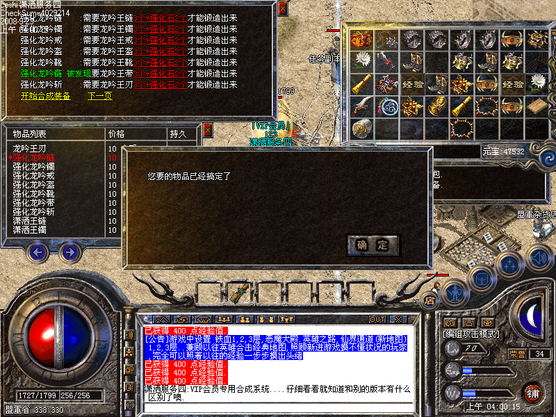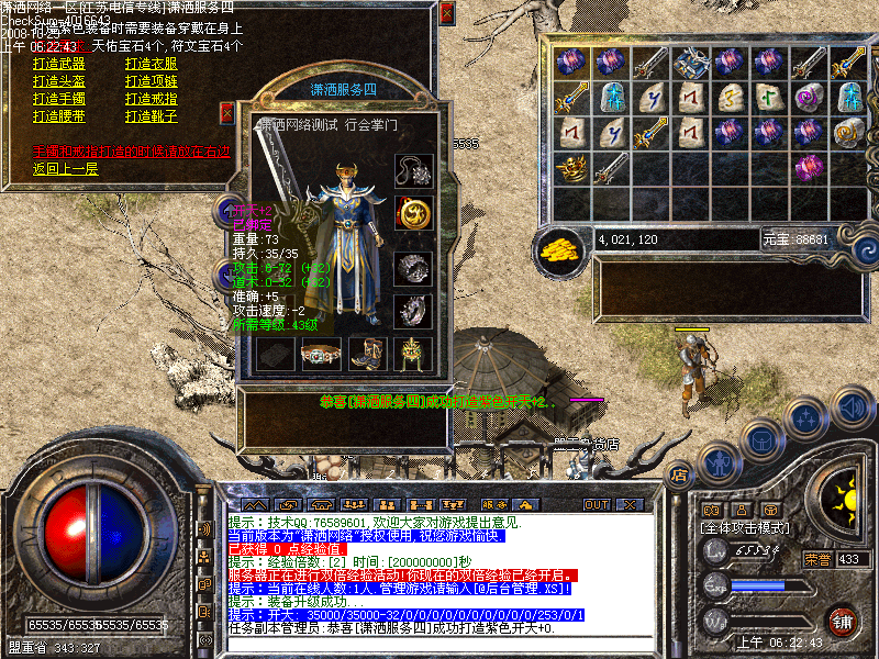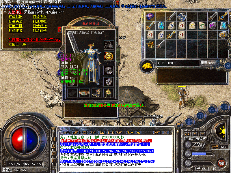 [潇洒网络]独创行内首家紫色装备升级系统.所有装备都可以通过升级成为紫色装备.装备名字是真正的紫色.最高升级+2.所附加的属性绝对让装备实力提升一大截.只要武器属性加的对,开天也能比顶级武器强悍.属性加成是随机性<测试版本不开放>