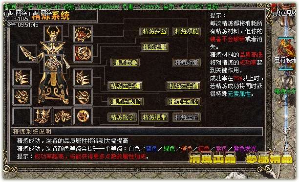 【装备精炼】将1件蓝色以上级装备的附加属性转移到高级装备上。因此,不管自己的装备是不是高级装备,都可以放心精炼,而不用担心浪费精炼材料。