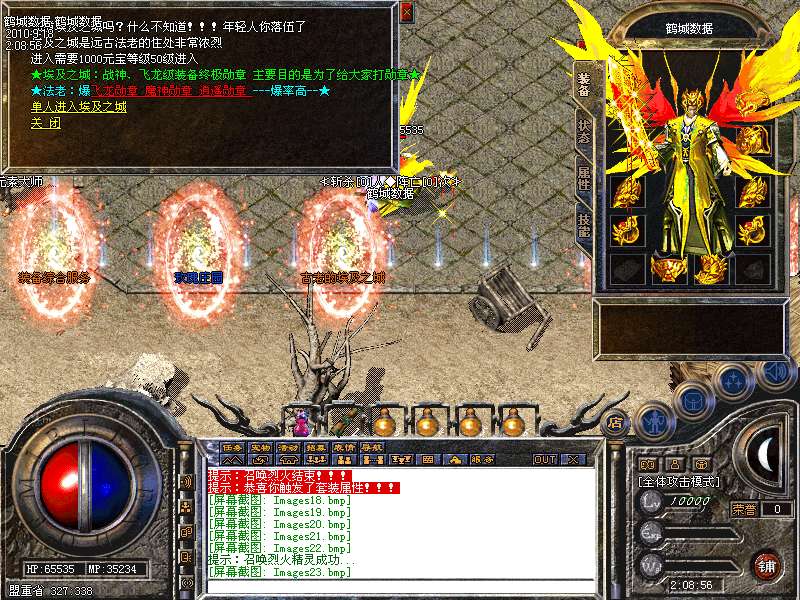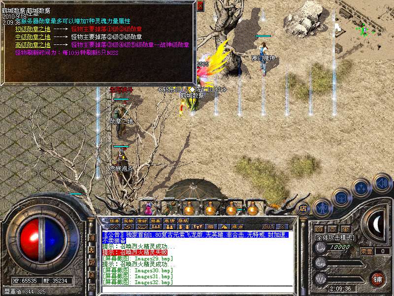 服务器在幻境7层,魔龙血域,袄玛3层,王者天堂,荣誉之城,寂静3层,地下陵墓每小时刷3到5只魔龙教主!爆战神开天装备喔!别错过!寂静1到3层是新人混装备元宝的最好地方。