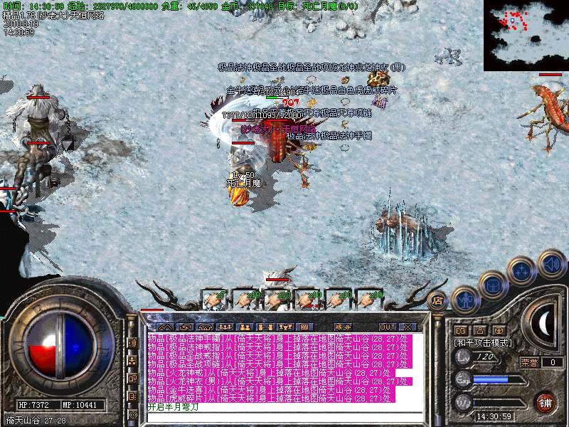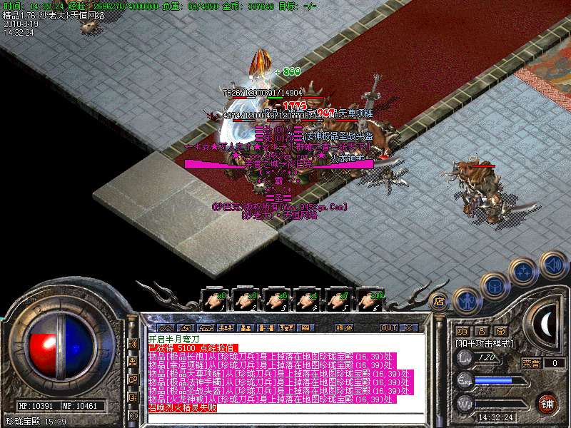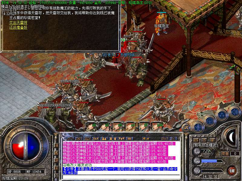 【精心爆率】经过我们技术人员的精心测试调整,爆率非常合理.服务器所有装备都能爆出,更是把BOSS爆率放在第一重点.注重BOSS爆率,绝对不会给你感觉到不爆赤月装备的无奈,同时也不会感觉到装备乱爆赤月的无趣.只要你有足够的实力,赤月装备绝对不是梦想!服务器的爆率为满足散人的需要,经过技术人员精心修改,大大的提高了终极BOSS的爆率.只有土安全区的暴不暴谁知道才爆幸运项链,极品爆率比其他高三倍,只有(终极BOSS)爆 (死神的微笑) 和 (霸天鬼斩)武器 .