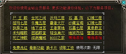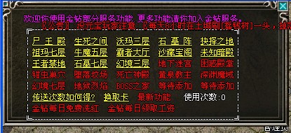 金钻特权:快速传送高级地图,每日领奖,优惠发广告,移动仓库,免费洗红等.更多请加入金钻贵族,努力赚元宝吧!