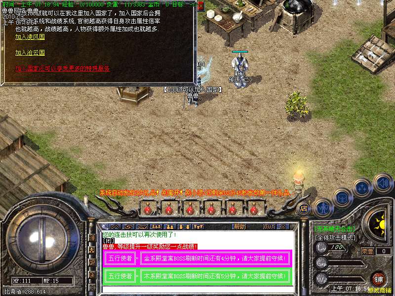 [国战系统]:每两小时轮流开放1次,每次半小时,每30秒能获得大量经验和荣誉,杀死敌国玩