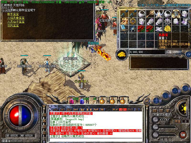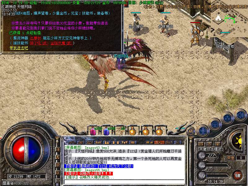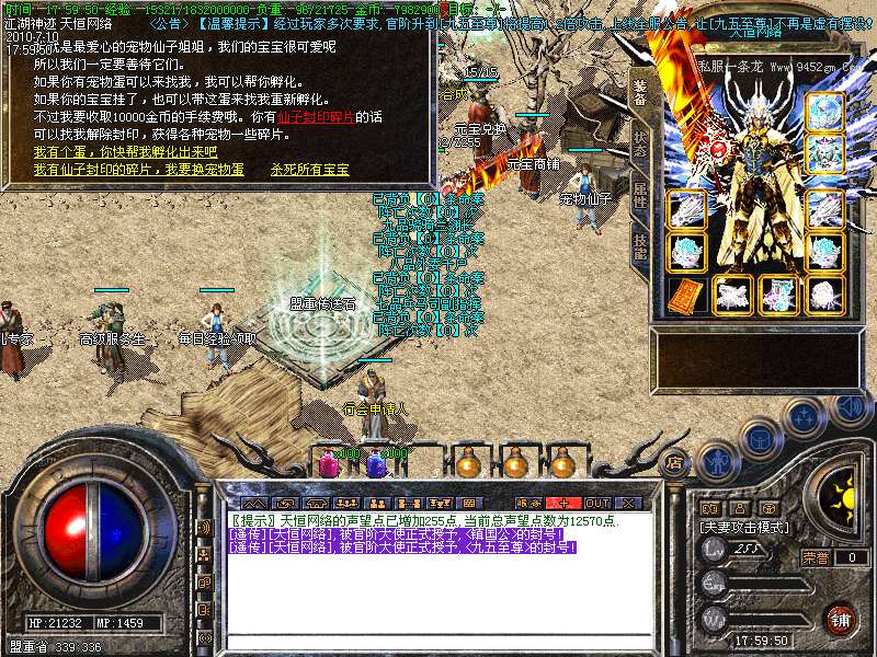 [宠物系统]:玩家可用灵宠神石进行喂养圣兽.此宠物带群攻.绝对是练级的好帮手!!!