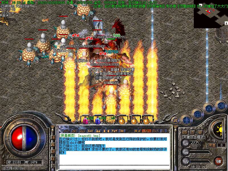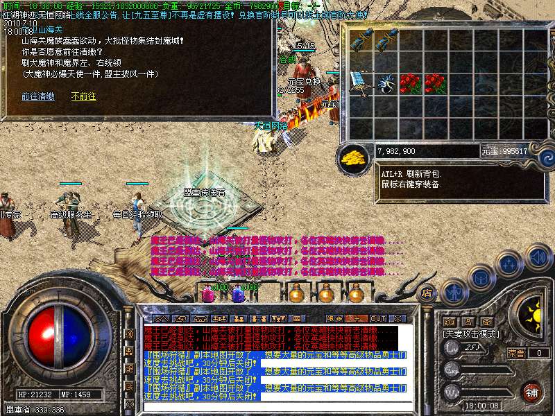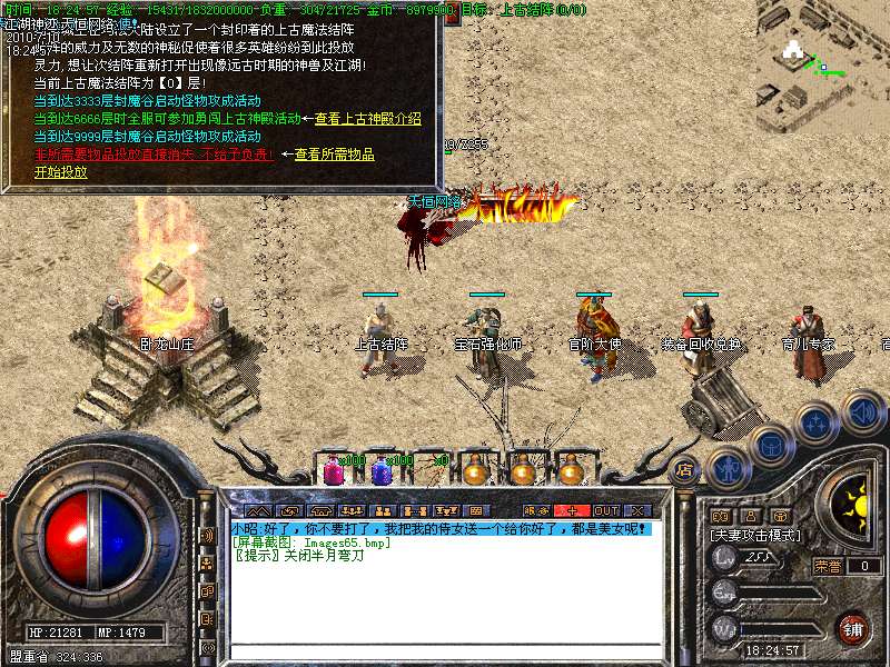 [上古结阵]:玩家在游戏打宝中.可将装备进行回收.每达回收一定程度.系统将自动怪物攻城!