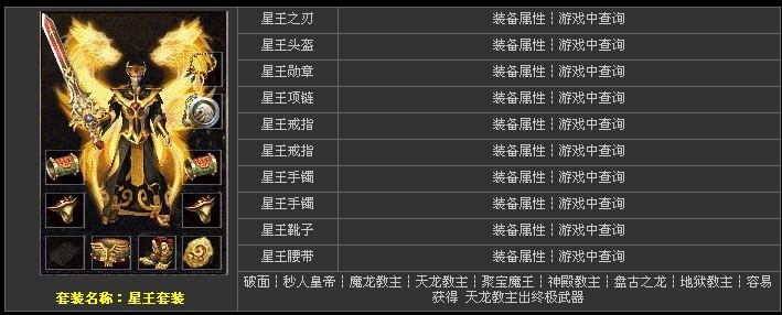 战神装备:各大地图BOSS(破面,秒人皇帝,神殿教主,地狱教主,天龙教主,魔龙教主等)终极武器:各大BOSS,天龙第八层必爆星王之刃