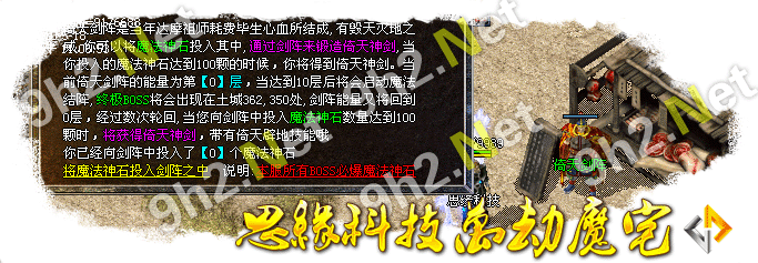 活动④:倚天剑阵,不断的向剑阵中投入魔法神石,达到100颗有机会奖励倚天剑一把,本服38个BOSS,每个BOSS必爆魔法神石一颗,每小时刷新一次BOSS.