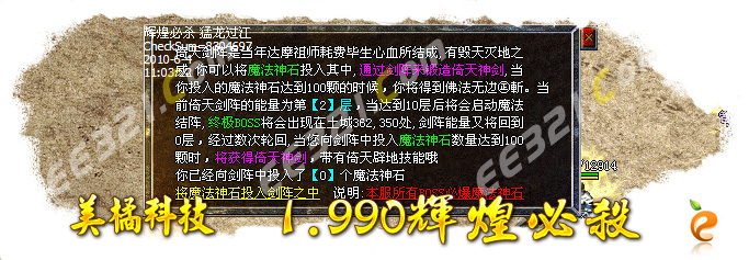 活动④ 倚天剑阵,不断的向剑阵中投入魔法神石,达到100颗有机会奖励倚天剑一把,本服38个BOSS,每个BOSS必爆魔法神石一颗, 每小时刷新一次BOSS.