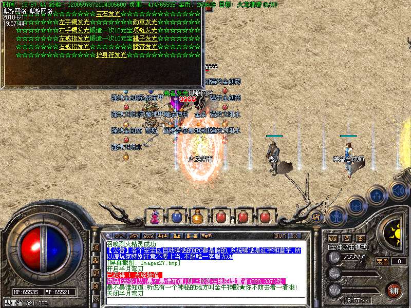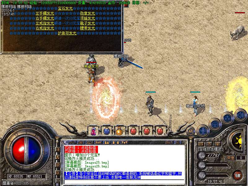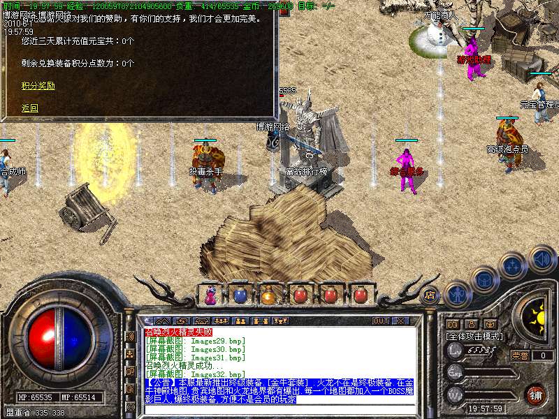 【攻城奖励】开区第2天开始沙战,第一任沙老大奖励10000元宝!合区后老区一天攻一次城,沙老大可以领取沙城主专用武器一把,攻击180,魔法150,道术150!