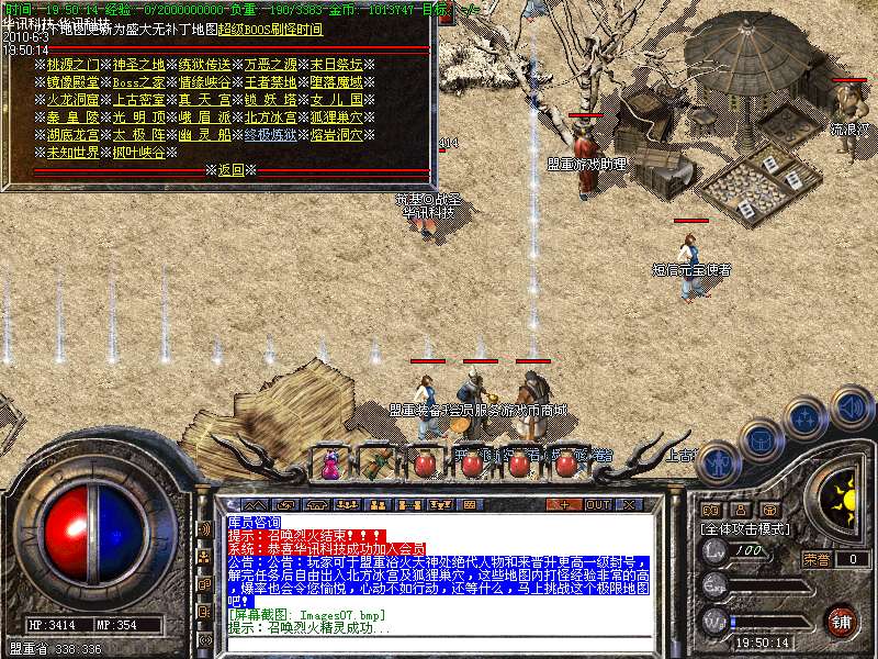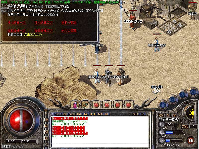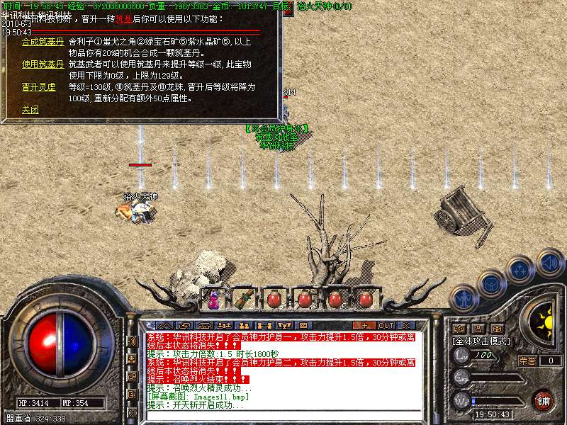 公告:看不到装备的朋友请到公告:高级装备攻略→上古合成(比奇城)→上古镶嵌(白日门)→2转装备(终极炼狱最后一层),每天中午12点30分举行年兽BOOS攻城,有几率爆出新技能