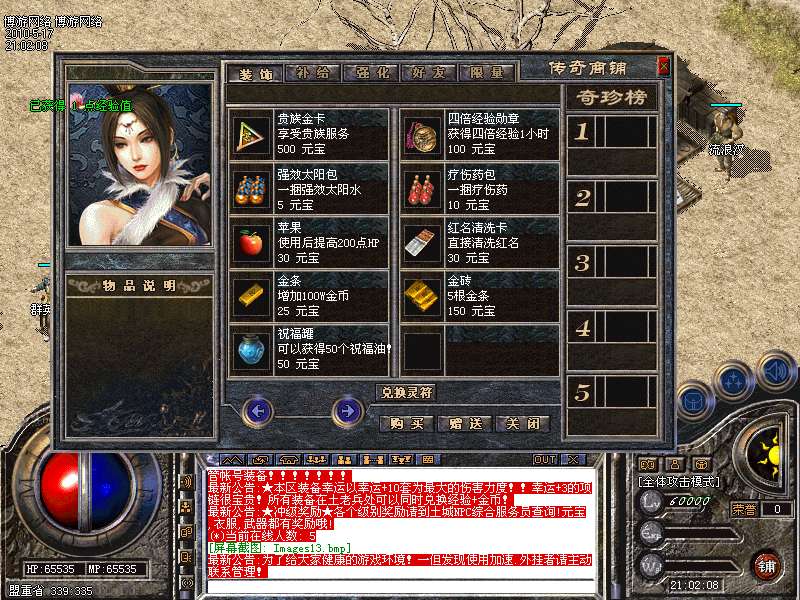 ★本区装备幸运以幸运+10套为最大的伤害力度!!幸运+3的项链很宝贵!所有装备在土老兵处可以同时兑换经验+金币!