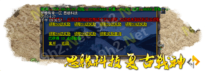 <255,252>本服设有升级奖励,50级奖励2000元宝,53级奖励8000元宝,55级奖励开天系列一把,具体请查看土城综合服务生!