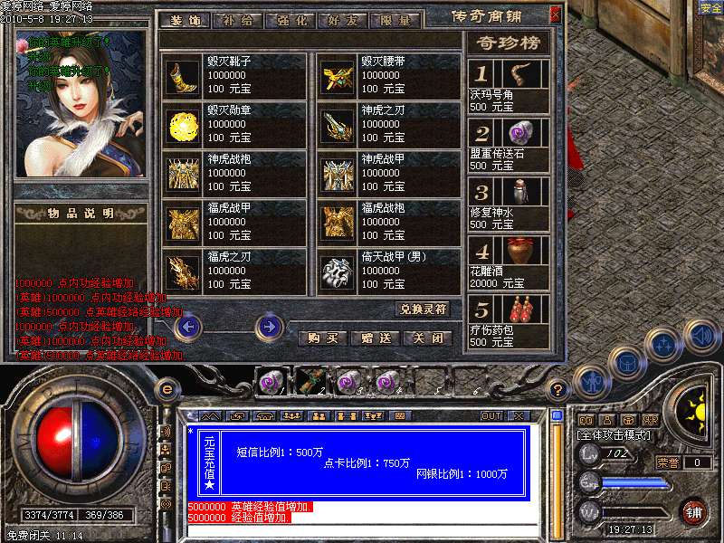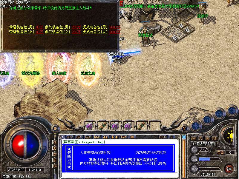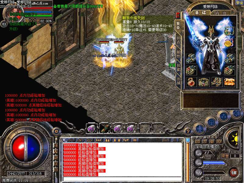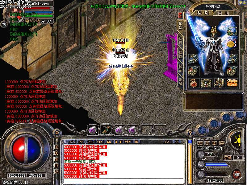 激情殿堂:每秒1200万经验200万内功经验!(可PK区域,可挂到本服顶级200级,内功255级)