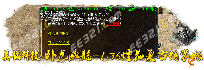 提示:登陆本服务器需要专用登陆器,否则不能登陆,按F12呼出自带内挂,封穿人穿怪。禁止使用各种变态加速外挂,一旦发现不管大号小号一律删号封IP处理!
