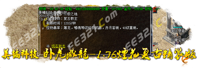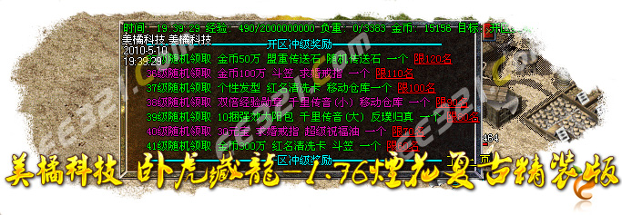 提示:本服务器高级怪物30分钟刷新,沙宝阁怪物60分钟刷新,新衣服暴率为1/100,赤月首饰暴率为1/20,苍月武器1/100。武器最高可升级7点,5分钟可取。赤月恶魔暴屠龙嗜魂,地藏王宝霸者之刃!