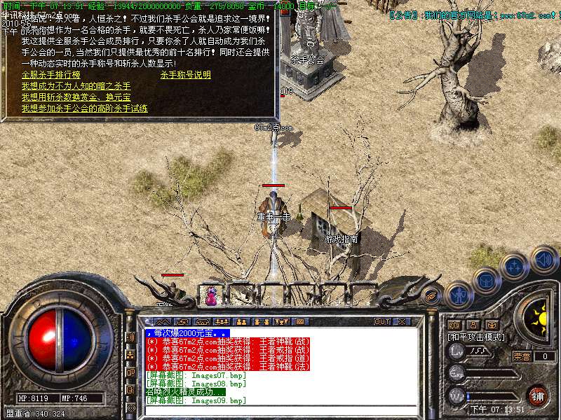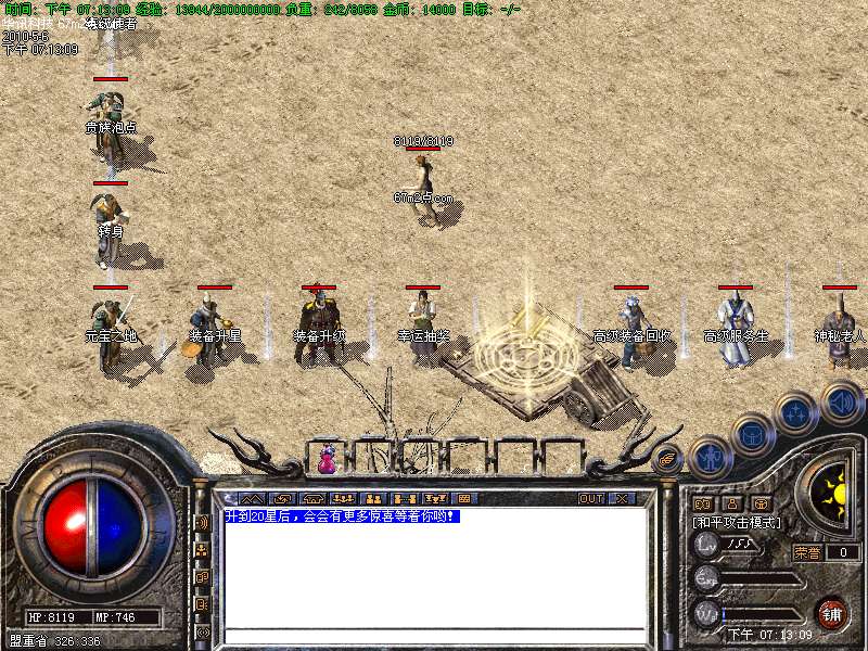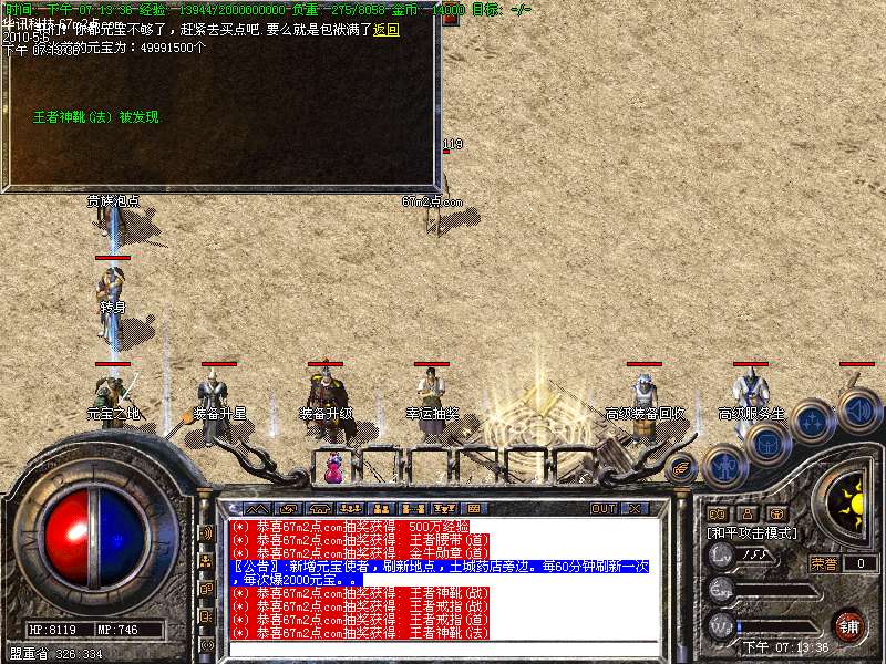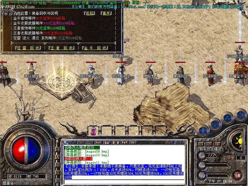 〖公告〗:非RMB得散人玩家注意了:你们可以去特殊地图打暗之怪物,可爆元宝,一般都是一个爆50,也会爆些逆火装备可以回收。有了300元宝就可以去雪域地图打逆火级和王者级装备,多的可以回收,在高级回收员那里,逆火5、王者20、金牛80并且有大量的经验哟。