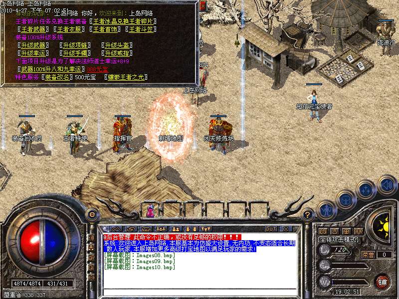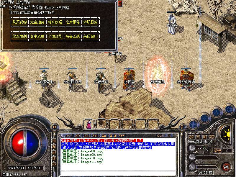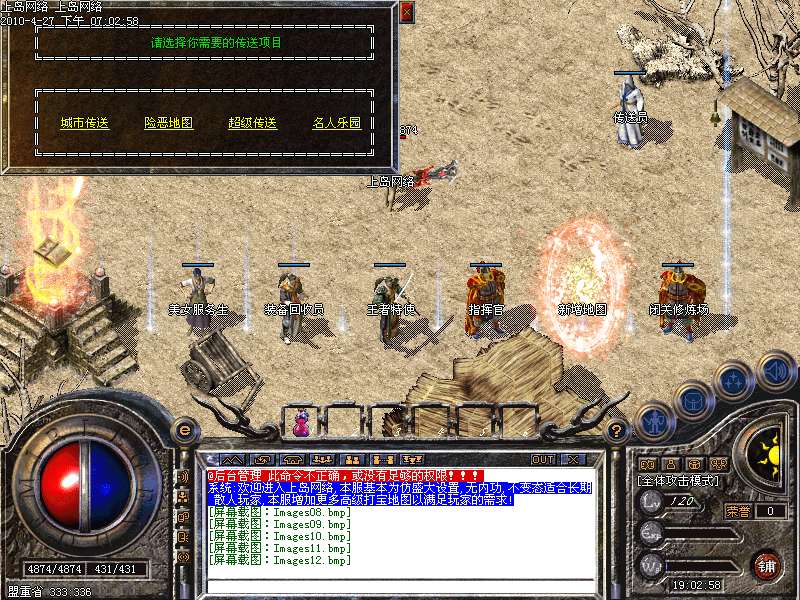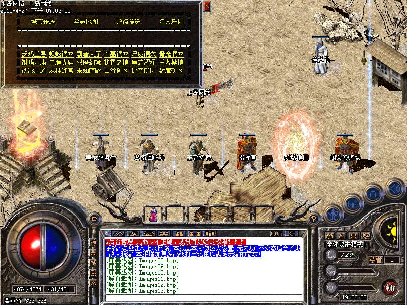 3.上线后可以在新人练级场,卧龙挖火龙珠,土城进入练级广场,闭关练级等处升级.