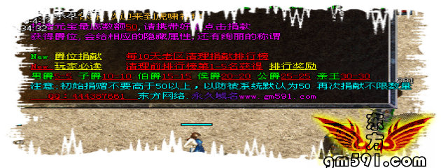 爵位:玩家通过捐献元宝,获得相应称谓,可得到相应的属性奖励,排行1,2,3每天会得到装备奖励,连续3天排行第一会的到