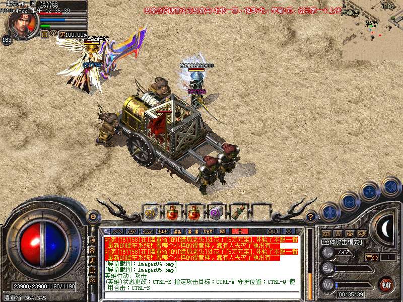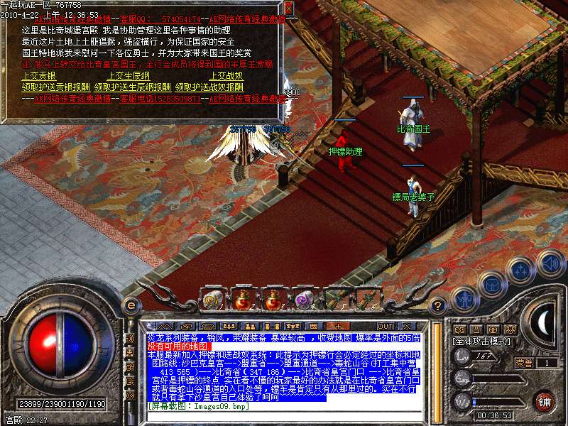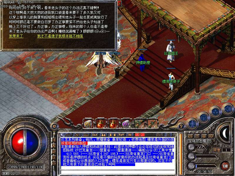 本服最新加入押镖和送战奴系统:此提示为押镖行会必定经过的坐标和地图路线:沙巴克皇宫—->盟重省—->盟重通道—->毒蛇山谷(打工集中营 413 565 )—->比奇省(347 186)—->比奇省皇宫门口 —->比奇省皇宫好是押镖的终点 实在看不懂的玩家最好的办法就是在比奇省皇宫门口或者毒蛇山谷通道的入口处等,镖车是肯定只有从那里过的。实在不行就只有拿下沙皇宫自己体验了呵呵~~~~~~~~~~~