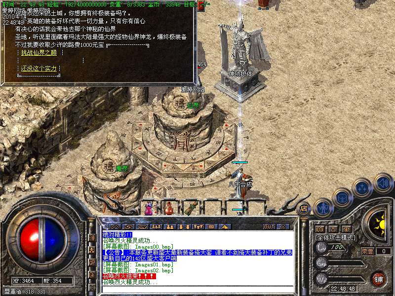 20.本服新增加地图 仙界 魔界 里面怪很猛 怪物狂暴最好装备的地方哦1小时刷新一次 每个地图每小时会刷一只死神战士 此怪可以暴出好装备和合成帝王权装备所需要的宝图和珠子。