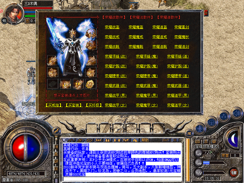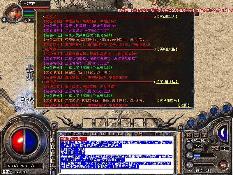 买装备的玩家,请到土杂货店NPC附近找带颜色的商城NPC购买!套装购买点图片即可,散件装备看清楚职业购买。