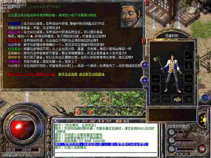 帮助按钮:非常强大的帮助按钮使您的游戏更方便游戏更明晰.在游戏的控制版有[帮助]按钮,或在游戏里输入[@帮助] 此按钮为本服重要特色钮.请玩家进入游戏后仔细查看,内有装备淬炼系统的启动.