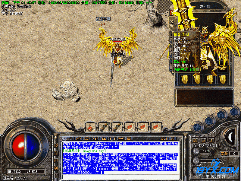 温馨提示:本服务器为方便玩家,开通了在线支付功能(支持游戏点卡和手机短信冲值),元宝比例为1:1000 所有物品均可在土城NPC“元宝商城”那里用元宝买到。详请请登陆官方网站:
